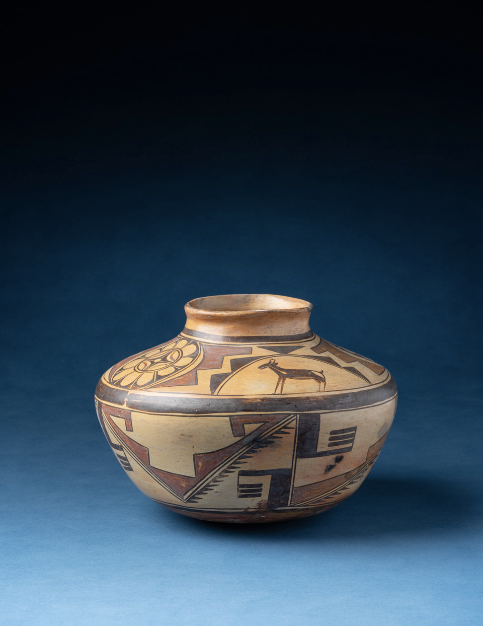 Well Fellow Seekers, I have always loved Pueblo Pottery, going back to my days as an Archaeologist. This pot is Hopi and is a Hano Polychrome, which is a 15th-16th Hopi pottery design style revived by a Hopi potter named Nampeyo in the late 19th century. This wonderful masterpiece of a pot probably dates to the early 20th century, say the 1920s or 1930s. I believe it was made by one of two potters, either Sadie Adams (1905-1995) or Myrtle Young who died in 1984. The pot is not signed so this is a guess based on style. If anyone has more information please let me know. It is available for purchase. Adios! - Lonesome