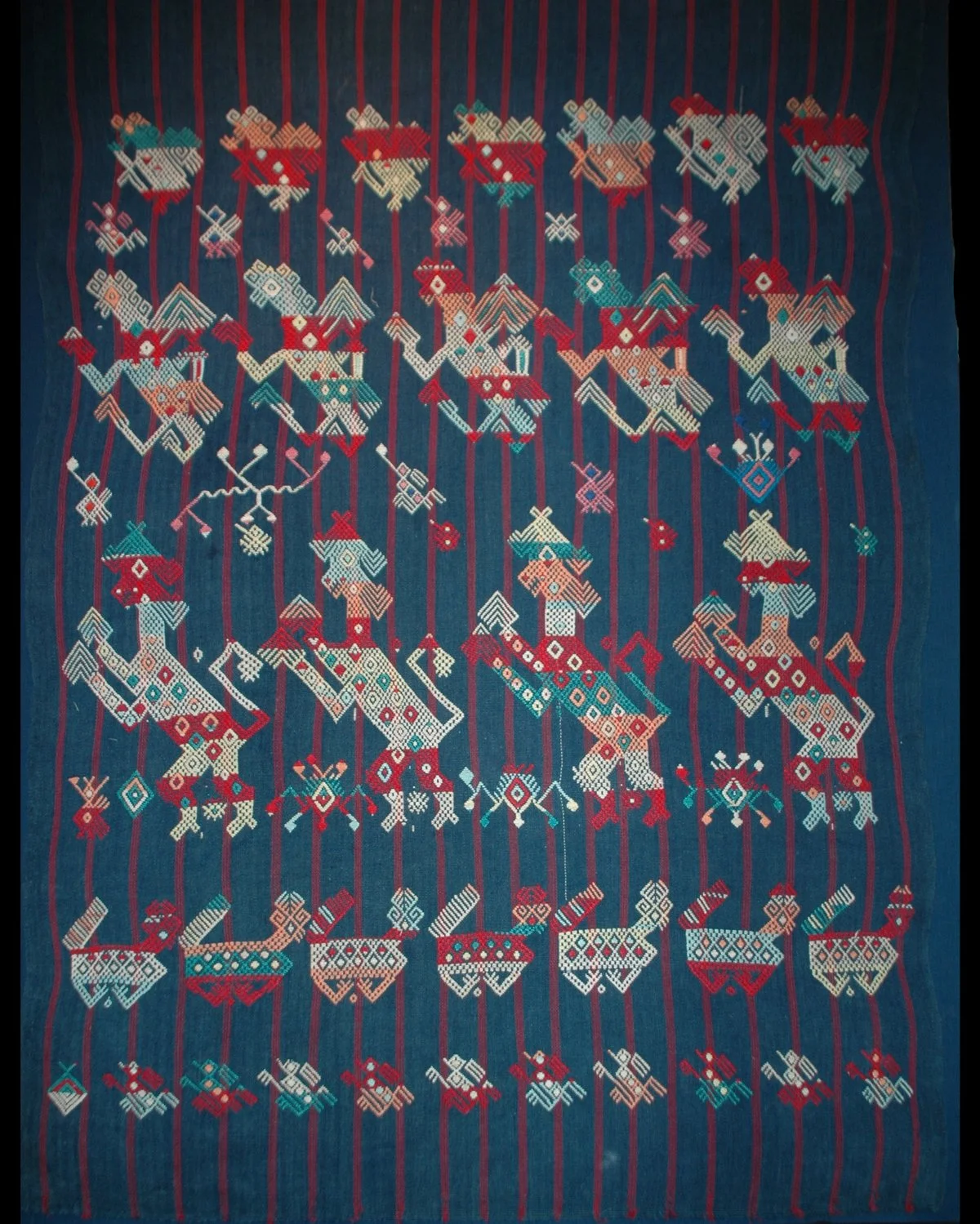 This Tzute is made of indigo, and possibly, cochineal dyed, Native-spun cotton thread and woven on a backstop loom. It is 42” long by 32” wide, (rather wide for a back strap loom). It is large for a Tzute, so it was probably made for special occasions, having to do with the Cofradia system for celebrating religious holidays. The surface of the cloth is covered with wonderful mythological creatures embroidered in cotton floss.