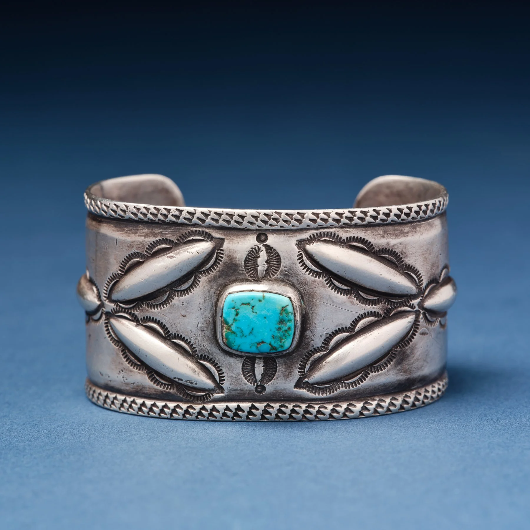 This one is ingot silver, probably dating from 1900-1920s. The design is fabulous with six repoussé ovals, clean precise stamping, and end of file stamped border. The kicker is the beautiful stone in a handmade bezel. They don’t get much better than this Seekers, so if you have a special person who has been especially good this year, treat them to this Special Bracelet. Now that is a lot of Special! Merry Christmas, Happy Holidays and All the Best in the New Year! Lonesome