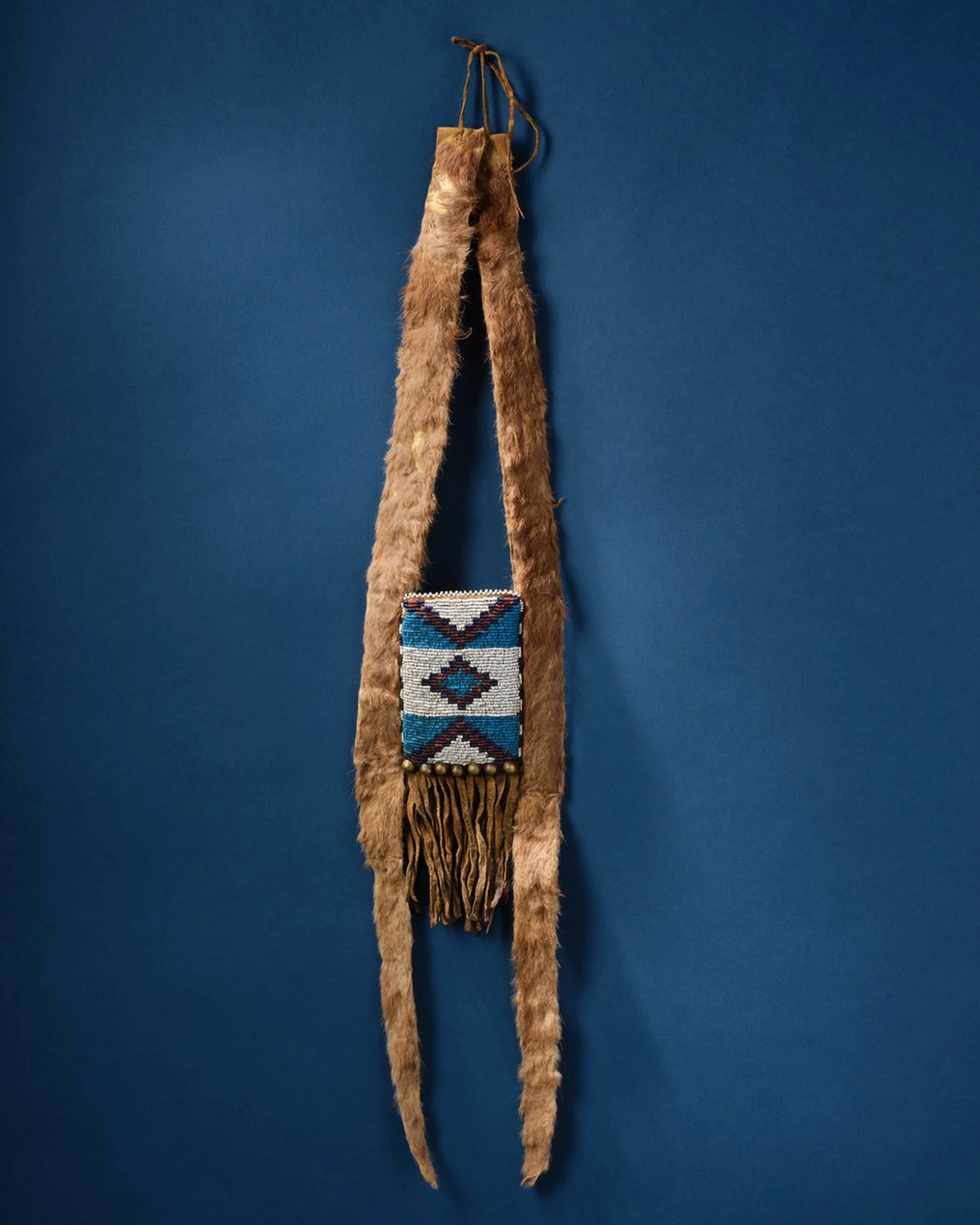 Vanity: every culture has it, both men and women. Well Fellow Seekers, this is a late 19th-century Blackfoot man’s mirror pouch. It was worn around the neck for a quick touch-up. The beadwork is really clean and crisp. The neck straps are made out of otter skins, perfect for the well-groomed, fancy dresser. It is for sale. See you down the trail. -Lonesome