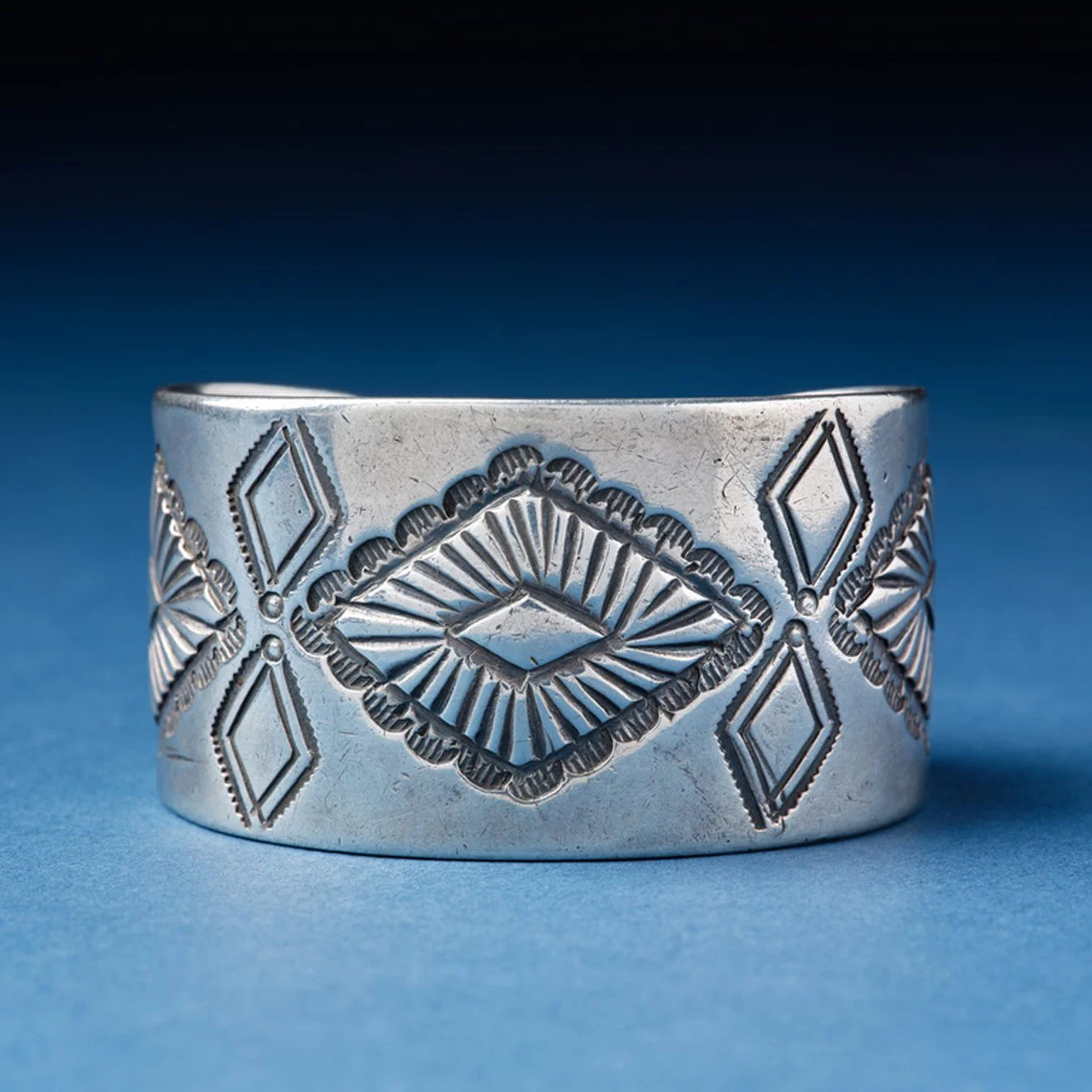 I always try and have one great bracelet, a “Killer” or “Smoker” or “Ripper” as one dealer used to say. This is an ingot bracelet probably dating to the late 19th or very early 20th century. It has a lot of cold chisel work and just a few stamps, both of which are quite wonderful, and it has great wear. The design is very similar to that of a 2nd phase concho/concha. It is currently for sale, and I doubt it will last long, but you know, I don’t care if this one sells or not because I would love to keep it. This is a great one Fellow Seekers. -Lonesome