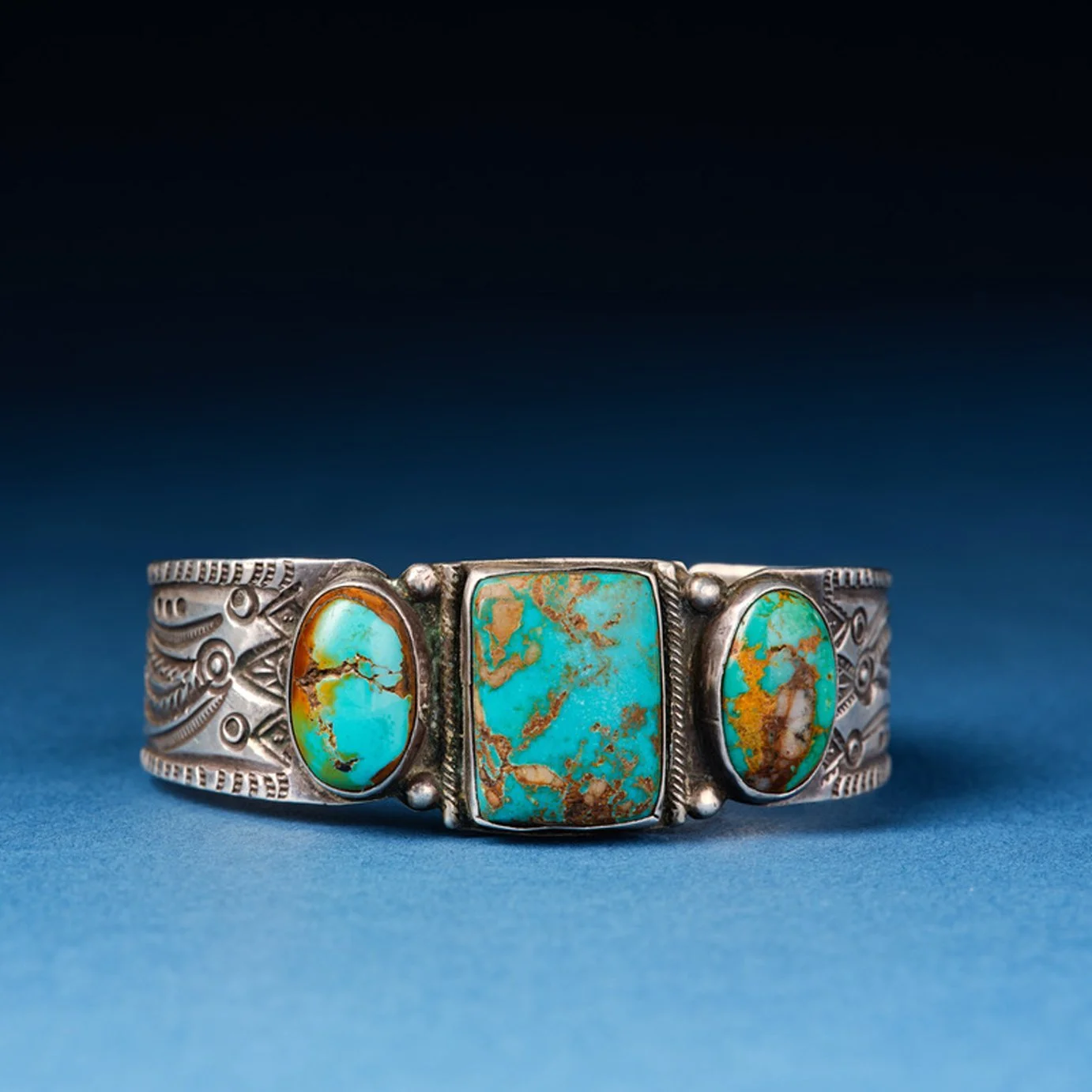 Hello again, Fellow Seekers! What do you think about this bracelet? It is ingot silver with fabulous stamping and beautiful turquoise. My guess is 1920s, maybe 1930s. Anyway, one of the reasons I bought it was the matrix of the stones, especially the center square one. The matrix looks like an archipelago in a blue-green tropical sea. I also love the fine twisted wire, silver balls, and filed notches. This is a really great early 20th-century Navajo bracelet. It is for sale and at not too crazy a price. Seekers, you might want to get on this one. I know it will look great on your wrist. -Lonesome