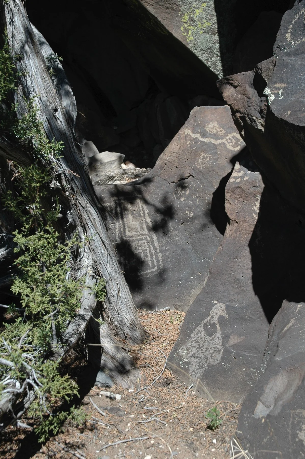 Many years later I returned to the little site and canyon. The pool was a shallow mud hole, not it’s crystal clear past self. I was alone, except for my trusty dog Zelly. I walked around the edge of the canyon and got to a very steep vertical wall I had not explored before. Why would I have? It was steep and dangerous, heavily wooded with twisted, snarled juniper but checking my compass it did face south. Most Pueblo petroglyphs do face south or east or a combination of both those 2 directions. I could see some natural rock walls that might be good for petroglyph placement, but given the other conditions it seemed very unlikely.